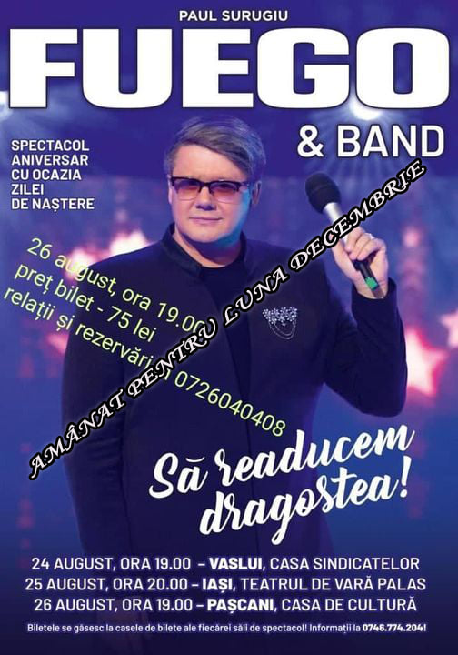 Fuego nu mai vine la Pascani, nici in aceasta luna. Concertul indragitului artist, ce trebuia sa aiba loc miercuri, 13 octombrie, a fost amanat, inca o data, dupa ce initial fusese anuntat pe 26 august. Reprogramarea a fost facuta in luna decembrie si a fost necesara din cauza ratei mare de infectare de la Pascani, ce a ajuns la 5,26 la mia de locuitori.