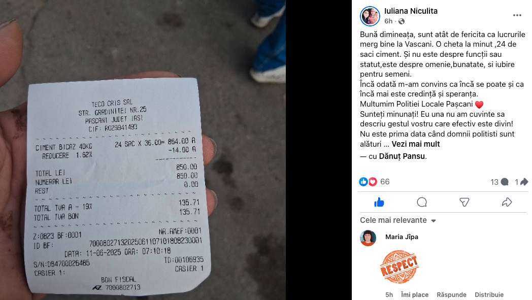Din fondurile colectate în cadrul unei „chete de suflet”, a fost achiziționată o cantitate importantă de ciment – 24 de saci – care vor fi folosiți la ridicarea locuinței. Gestul lor vine într-un moment esențial pentru avansarea lucrărilor și este cu atât mai valoros cu cât vine din partea unor oameni care, zi de zi, își pun în slujba cetățeanului nu doar atribuțiile legale, ci și compasiunea.
