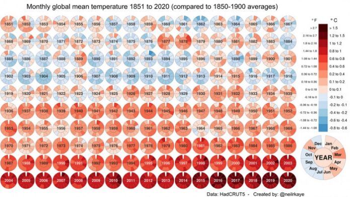 Graficul, care poate fi deschis la rezoluție mare aici, a fost realizat de Neil R. Kaye, om de știință specializat în date climatice, care a comparat temperaturile medii lunare globale la suprafața Pământului din 1851 până în 2020 cu media temperaturilor medii lunare din perioada preindustrială 1850-1900.