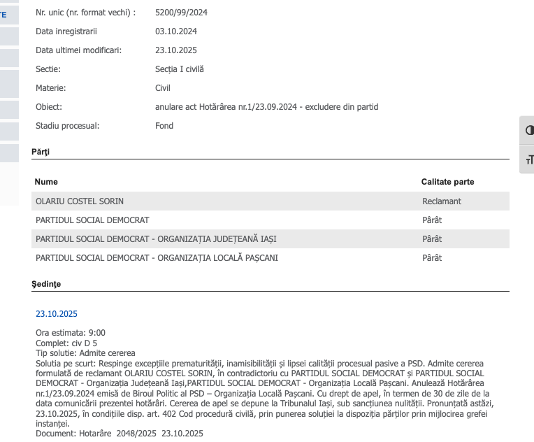 Răsturnare de situație la PSD Pașcani. Tribunalul Iași a anulat Hotărârea nr. 1/23.09.2024 emisă de conducerea organizației prin care consilierul Sorin Olariu a fost exclus din partid. Mai exact, judecătorii ieșeni au admis cererea formulată de consilierul pășcănean și au respins excepțiile invocate de PSD Pașcani, după zece amânări. Hotărârea nu este definitivă și poate fi contestată în apel la Tribunalul Iași în maximum 30 de zile. În acest context, Olariu rămâne în continuare consilier local, iar dacă hotărârea instanței va rămâne definitivă, își va recăpăta drepturile depline de membru al PSD.