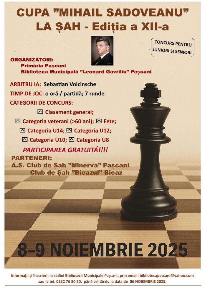 Pasionații de șah sunt așteptați în perioada 8–9 noiembrie 2025 la Cupa „Mihail Sadoveanu”, competiție cu tradiție organizată de Biblioteca Municipală „Leonard Gavriliu” și Primăria municipiului Pașcani. Evenimentul, ajuns la cea de-a XII-a ediție, va avea loc la sediul Primăriei și se va desfășura în sistem open, pe șapte runde.