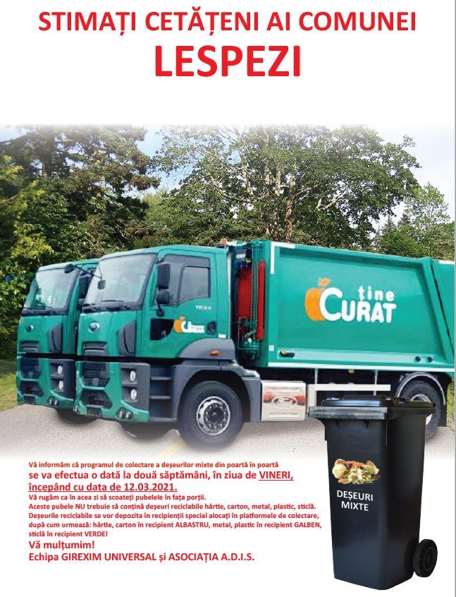 De saptamana viitoare, operatorul judetean de salubritate, Girexim, va colecta gunoiul menajer si din comuna Lespezi. Pe 12 martie, va fi prima zi de activitate, urmand ca apoi, strangerea deseurilor sa se faca o data la doua saptamani, in ziua de vineri, de catre doua masini ale firmei.