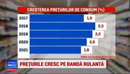 Inflaţia, adică creşterea preţurilor, are un efect direct în nivelul de trăi. Adică faţă de acum un an, cu 10 lei nu mai cumpărăm 10 pâini, să spunem, ci doar 8, din cauza creşterii preţurilor. Şi iată în acest grafic cu ce viteza cresc. Am ajuns la o rată de 1,8, cea mai mare din ultimii 4 ani – în noiembrie 2013 mai aveam aşa ceva. Iar acesta este doar începutul scumpirilor, spun cei de la Comisia Naţională de Prognoză.