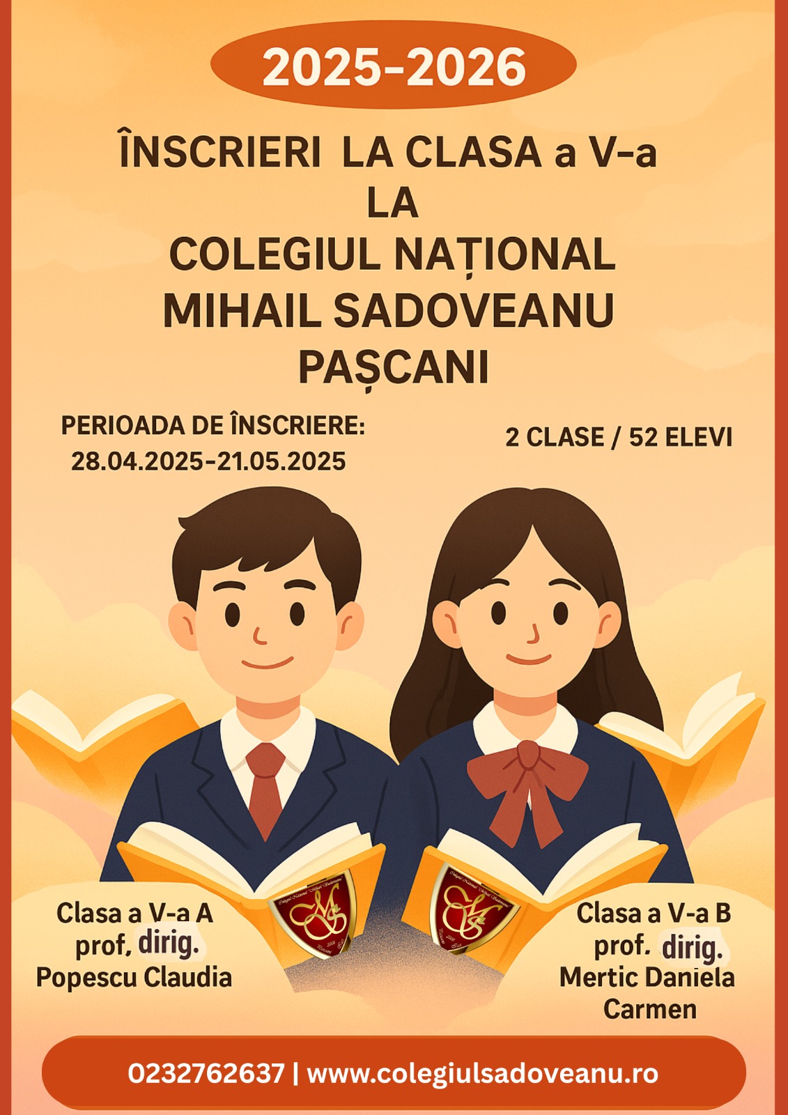 S-a dat startul înscrierilor în clasa a V-a la Colegiul Național Mihail Sadoveanu din municipiul Pașcani. Începând cu 28 aprilie și până pe 21 mai, părinții își pot înscrie copiii pentru anul școlar ce va începe din toamnă.