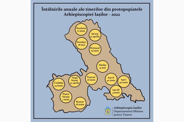În perioada 27 aprilie – 30 iunie 2022 va avea loc cea de a VI-a ediție a Întâlnirilor anuale ale tinerilor din protopopiatele Arhiepiscopiei Iașilor. Aceste activități se organizează cu binecuvântarea Înaltpreasfințitului Părinte Mitropolit Teofan, de către Departamentul de Tineret al Sectorului de Misiune, în colaborare cu protoieriile eparhiei.