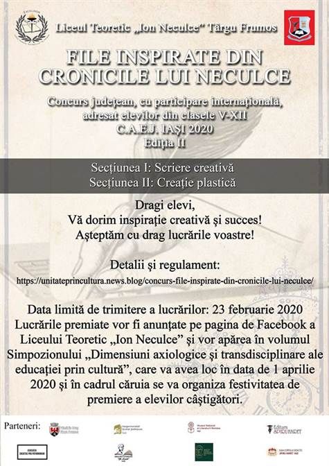 Liceul Teoretic ,,Ion Neculce” din Târgu Frumos invită elevii de gimnaziu și liceu să participe la concursul județean „File inspirate din cronicile lui Neculce” , ediția a II-a.
