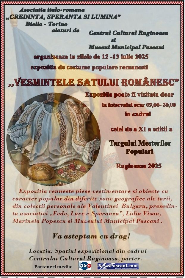 Comunicat: Primaria comunei Ruginoasa,Centrul Cultural Ruginoasa, în parteneriat cu Muzeul Municipal Pașcani și asociația italo-română „Credință, Speranță și Lumină” Biella-Torino, organizează expoziția „Veșmintele satului românesc”, ce va aduce în fața publicului o colecție de piese vestimentare și obiecte cu caracter popular, provenite din diverse zone ale țării.