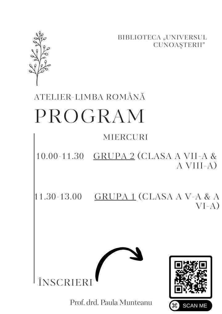 Vă invităm cu drag la Biblioteca „Universul Cunoașterii” din Târgu Frumos, la Atelierul de Limba română, în fiecare zi de miercuri, iar pentru o mai bună desfășurare a activităților, am organizat două grupe: