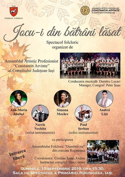 Mentionam ca spectacolul este organizat de Ansamblul Artistic Profesionist „Constantin Arvinte” al Consiliului Judetean Iasi iar intrarea este gratuita.