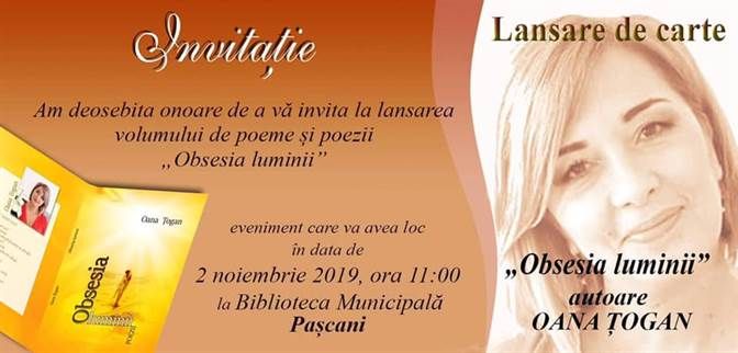 Iubitorii de carte sunt invitati sa participe la lansarea volumului de poeme si poezii “Obsesia luminii”, semnata de pascaneanca Oana Togan. Cititorii sunt asteptati sambata, 2 noiembrie, incepand cu ora 11:00, la Biblioteca Municipala din Pascani.