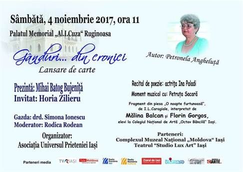 Sambata va invităm la cultură! Palatul “Al. I.Cuza” din Ruginoasa va găzdui o lansare de carte a profesoarei din comună, Petronela Angheluță. Volumul “Gânduri…din cronici”, apărut sub egida Asociaţiei “Universul Prieteniei”, va fi prezentat de scriitorul Mihai Batog Bujeniţă. La eveniment, va fi invitat de onoare și poetul Horia Zilieru.