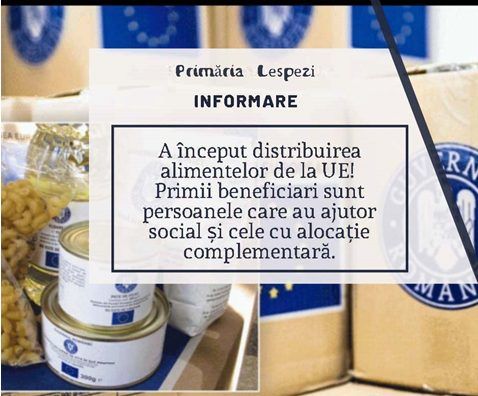 Vă anunțăm că în intervalul orar 09.00 – 12.00, până la 15 Mai, la Căminul Cultural din Lespezi se distribuie pachetele cu alimente de la UE destinate persoanelor defavorizate.