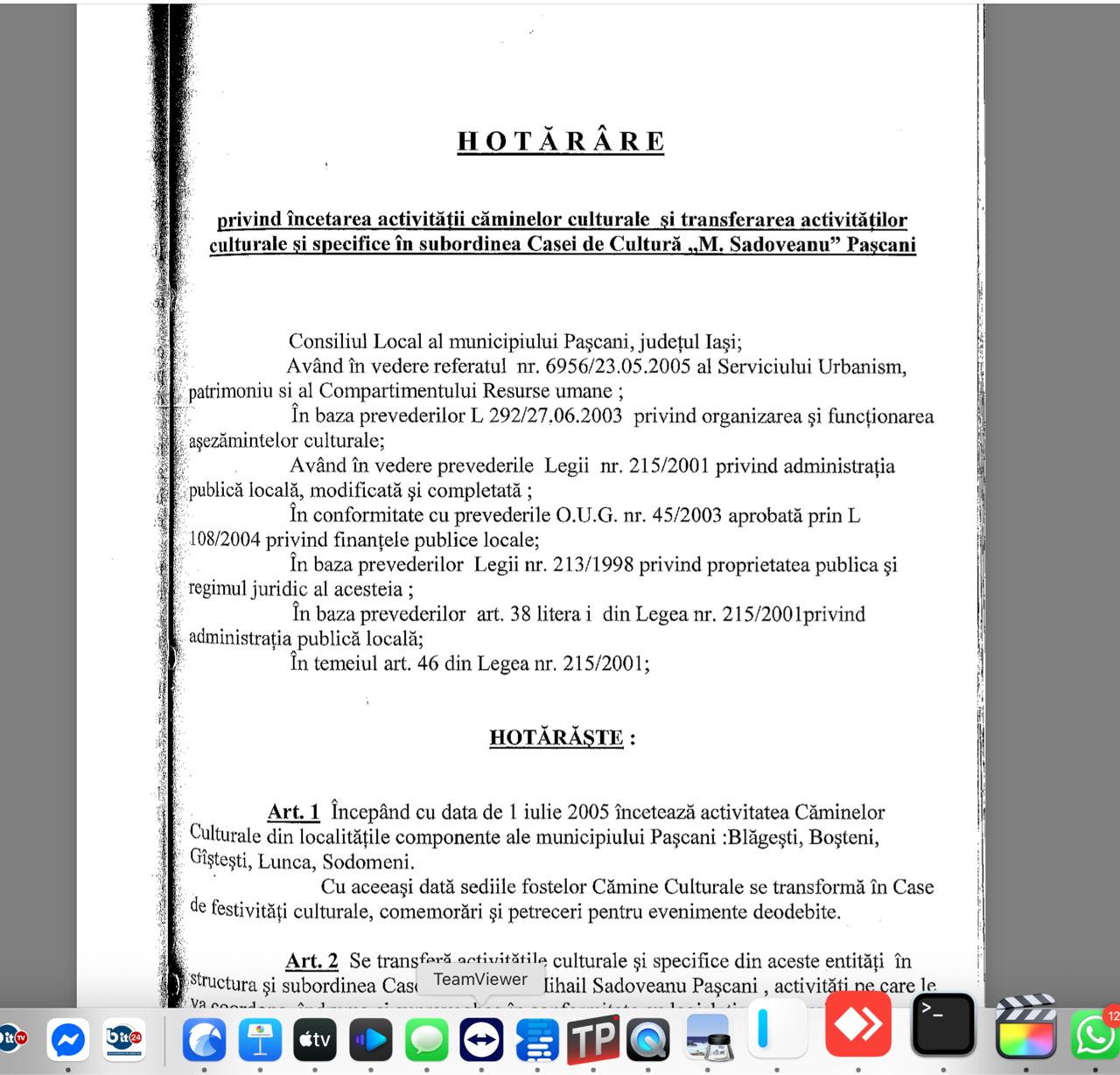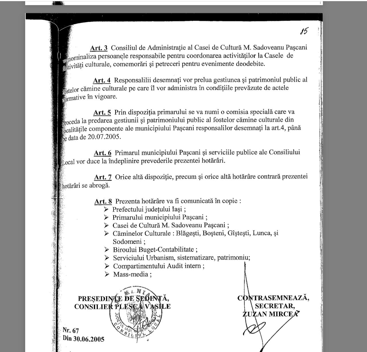 În document se arată că, începând cu data de 1 iulie 2005, încetează activitatea căminelor culturale din suburbii, iar clădirile se transformă în case de festivități, comemorări și petreceri pentru evenimente deosebite. Ulterior au fost stabilite și tarifele de închiriere. De asemenea, activitățile culturale specifice au fost transferate în subordinea Casei de Cultură „Mihail Sadoveanu” din Pașcani. Primarul Pașcaniului a fost însărcinat să ducă la îndeplinire această hotărâre, iar conducerea Casei de Cultură să nominalizeze persoanele responsabile. În mod surprinzător, atât directoarea Casei de Cultură, cât și conducerea Primăriei Pașcani susțin că nu au văzut această hotărâre, deși este pe site-ul instituției. Ea a fost aplicată timp de câțiva ani de zile, dar cheile de la căminele culturale au fost luate după 2008, la solicitarea Primăriei, și au fost desemnați alți responsabili.