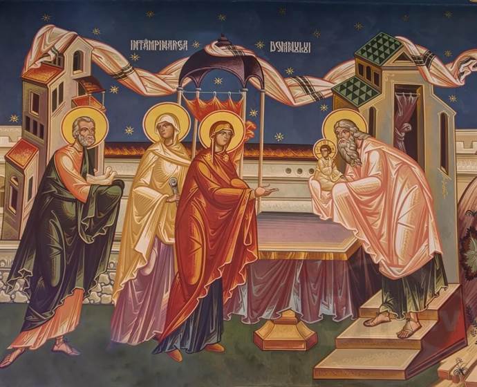 Potrivit scrierilor Noului Testament, Fecioara Maria şi pruncul Iisus au fost întâmpinaţi la templu de dreptul Simeon şi prorocita Ana. Dreptul Simeon, spune tradiţia creştină, a făcut parte din traducătorii Pentateuhului din limba ebraică în greacă şi, în momentul în care a ajuns la textul „Iată Fecioara va lua în pantece şi va naşte fiu“ acesta ar fi înlocuit termenul „fecioară” cu „femeie”. De aceea, se spune că, pentru necredinţa sa, Dumnezeu i-a făgăduit că nu o să moară până nu va vedea pe Mesia născut din Fecioara. Tot potrivit tradiţiei, dreptul Simeon ar fi spus, atunci când l-a luat în braţe pe Hristos, „Acum slobozeşte (eliberează) pe robul Tău, Stăpâne, după cuvântul Tău, în pace, că văzură ochi mei mântuirea Ta, pe care ai gătit-o înaintea feţei tuturor popoarelor, lumina spre descoperirea neamurilor şi slava poporului Tău, Israel“.