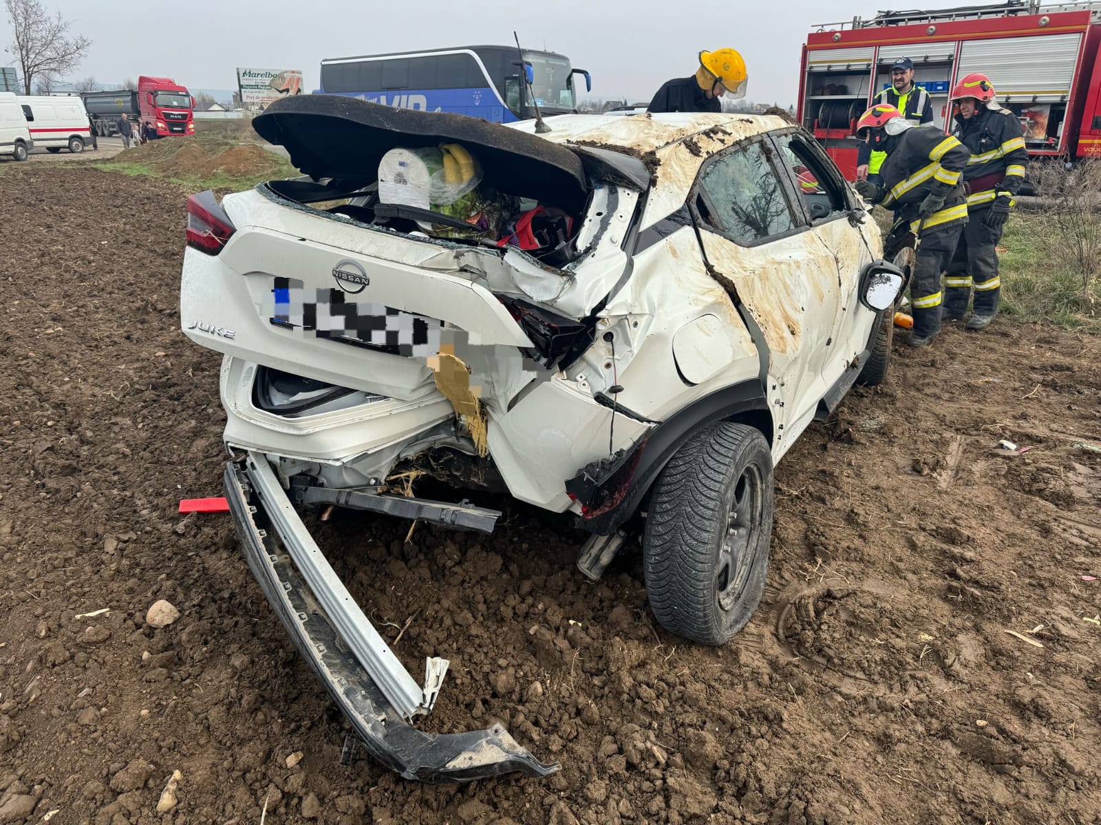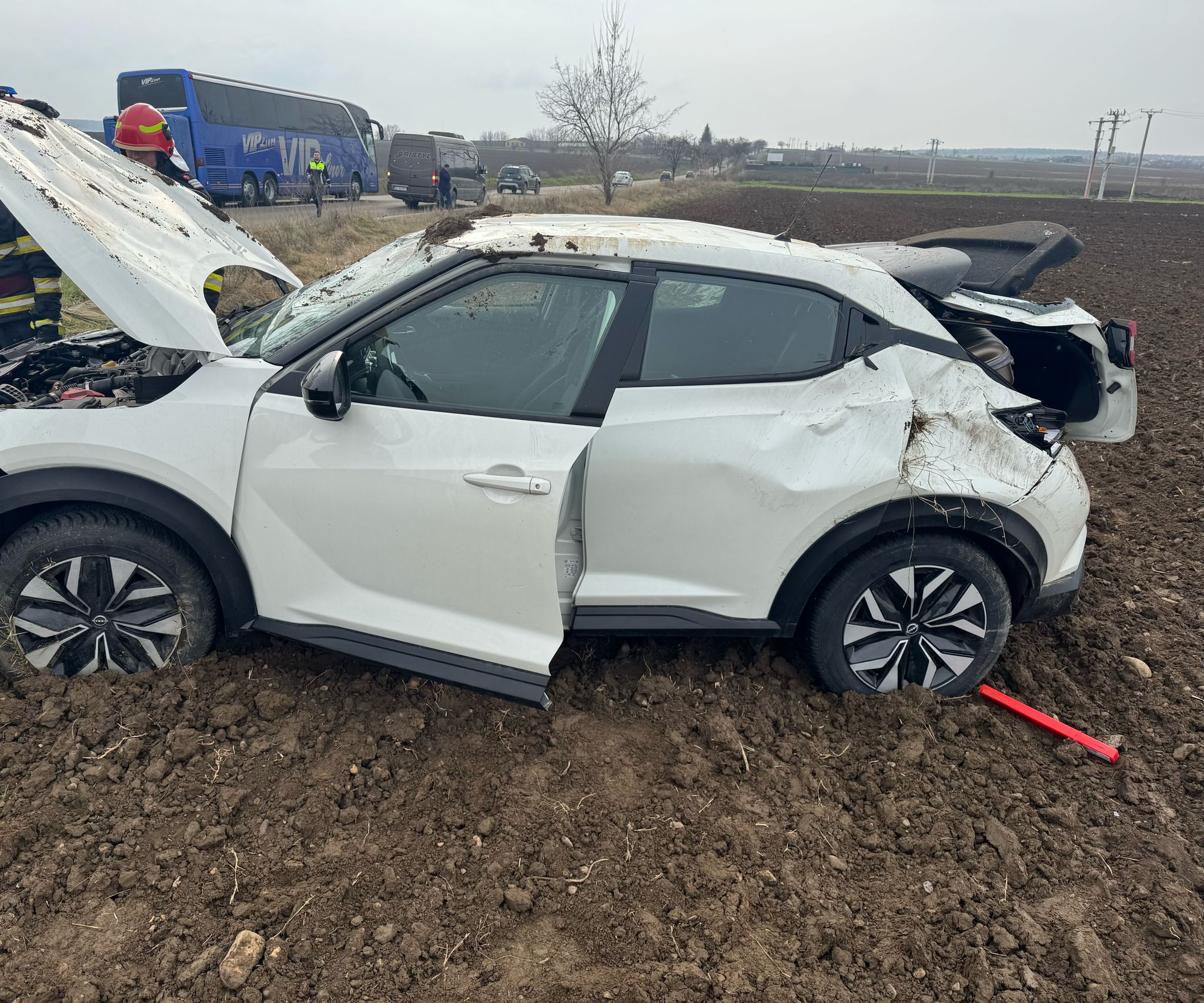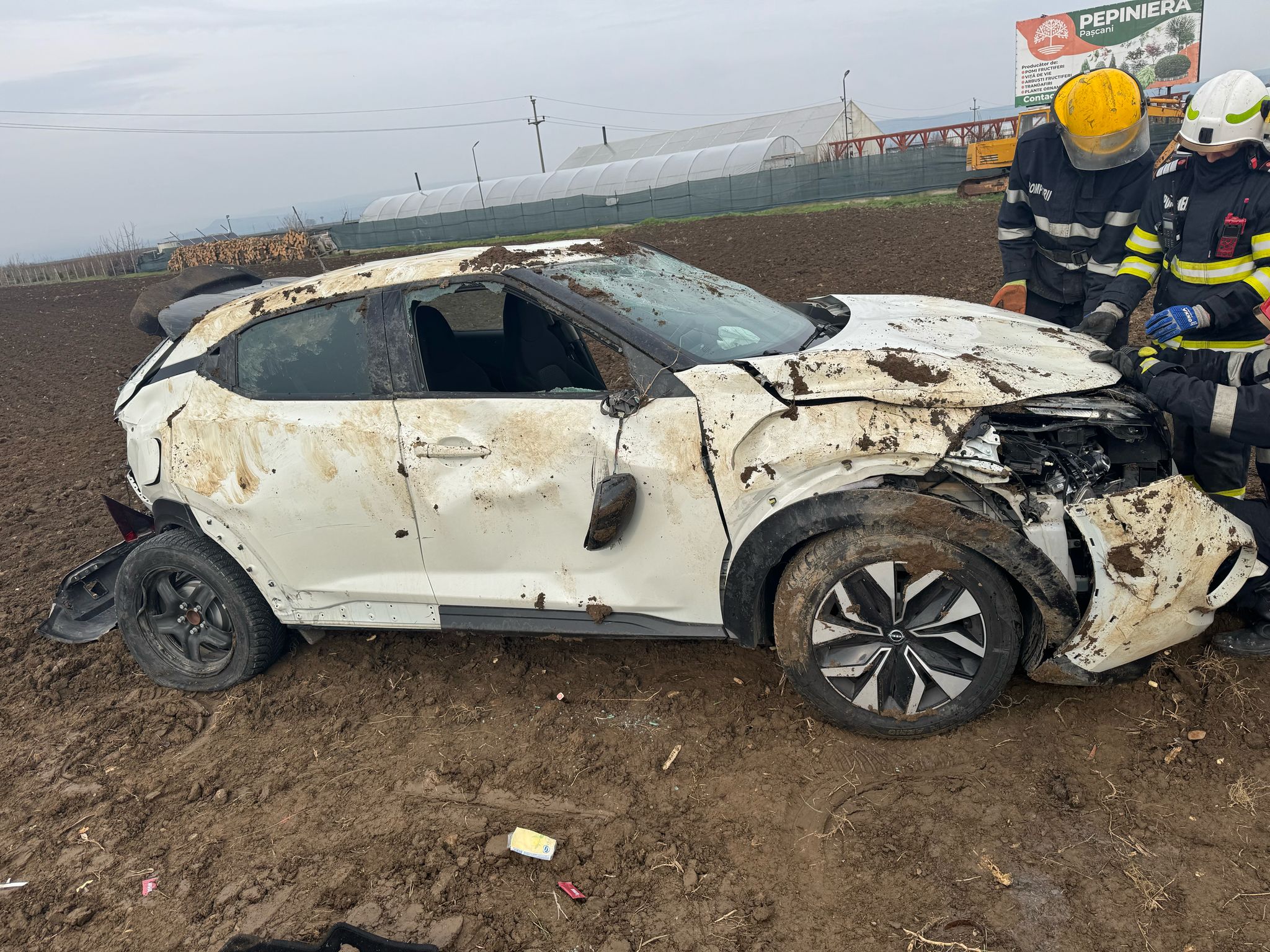 Accident rutier la ieșirea din Pașcani, vineri, 28 martie, după amiază. Șoferul unei mașini a pierdut controlul direcției vehiculului, a părăsit carosabilul și s-a răsturnat pe un câmp.