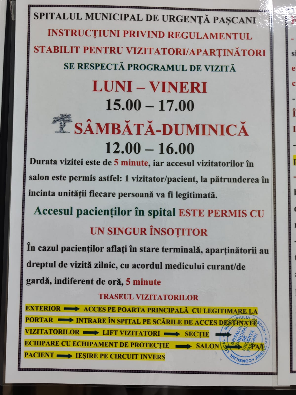 Astfel, vizitele pot fi făcute pe toate sectiile de luni până vineri numai între orele 15:00-17:00 si sambata și duminica între orele 12:00-16:00.