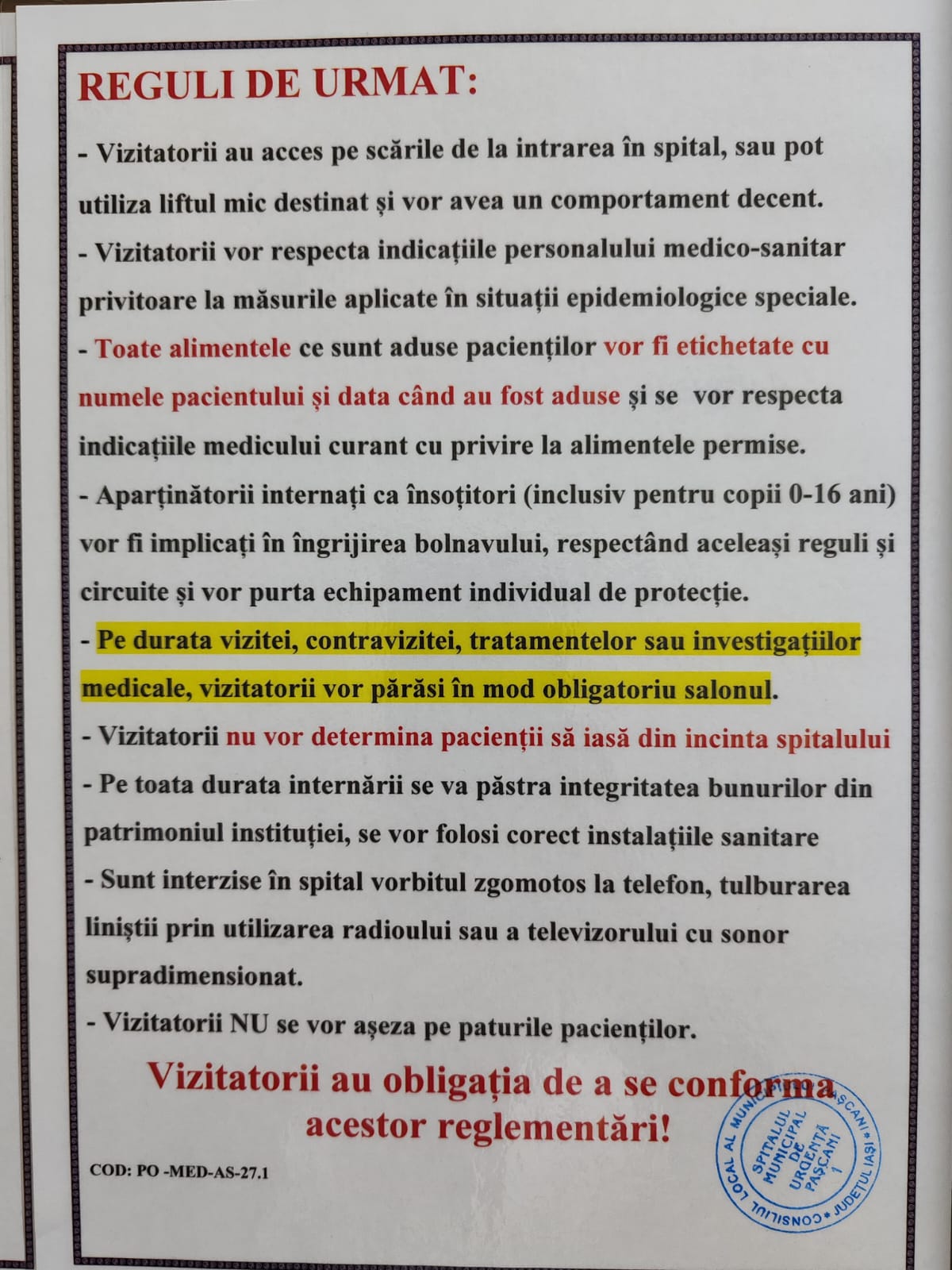 “Este obligatorie purtarea de catre apartinatori/vizitatori a mastii de protectie și a echipamentului de protectie suplimentar acolo unde patologia sectiei impune acest lucru si evitarea contactului cu pacientii deja spitalizati in cazul aparitiei simptomatologiei respiratorii specific” transmit reprezentanții Spitalului de Urgență Pașcani.