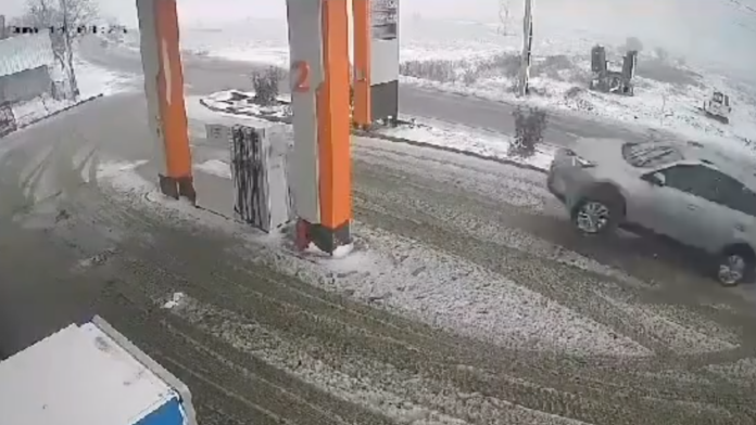 Camerele de supraveghere amplasate într-o benzinărie au surprins cum maşina condusă de tânără trece razant prin staţie, chiar pe lângă o pompă! Autoturismul s-a oprit abia în curtea unei locuinţe, după ce a distrus un gard.