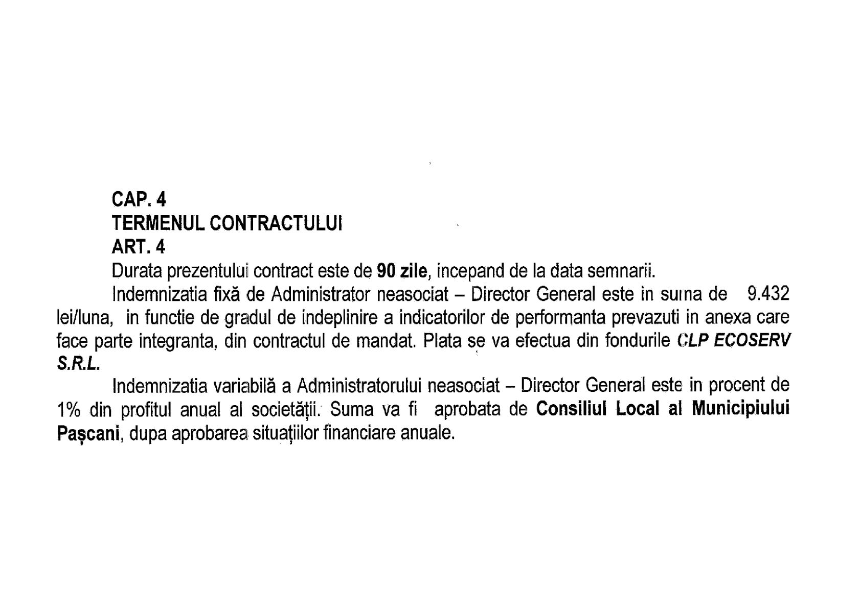 Noul director al societății CLP Ecoserv SRL Pașcani ar urma sa câștige un salariu mai mare decât cel al actualului manager si al celor 4 membri din Consiliul de Administratie, la un loc. Informația apare chiar in draft-ul contractului de mandat anexat la proiectul de hotărâre propus de primarul Marius Pintilie, de schimbare din funcție a actualei conduceri.