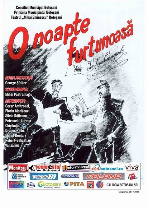 Vineri, 2 februarie 2018, începând cu ora 19.00 sunteți așteptați la teatru! Protagoniștii vor fi actorii Teatrului “Mihai Eminescu” din Botoșani care vor intra în pielea personajelor din piesa de teatru “O noapte furtunoasă” de Ioan Luca Caragiale. Comedia este în regia lui George Șfaițer. Prețul unui bilet este de 40 de lei. Pentru informații și rezervări, sunați la 0726040408 -Samir Marcu.