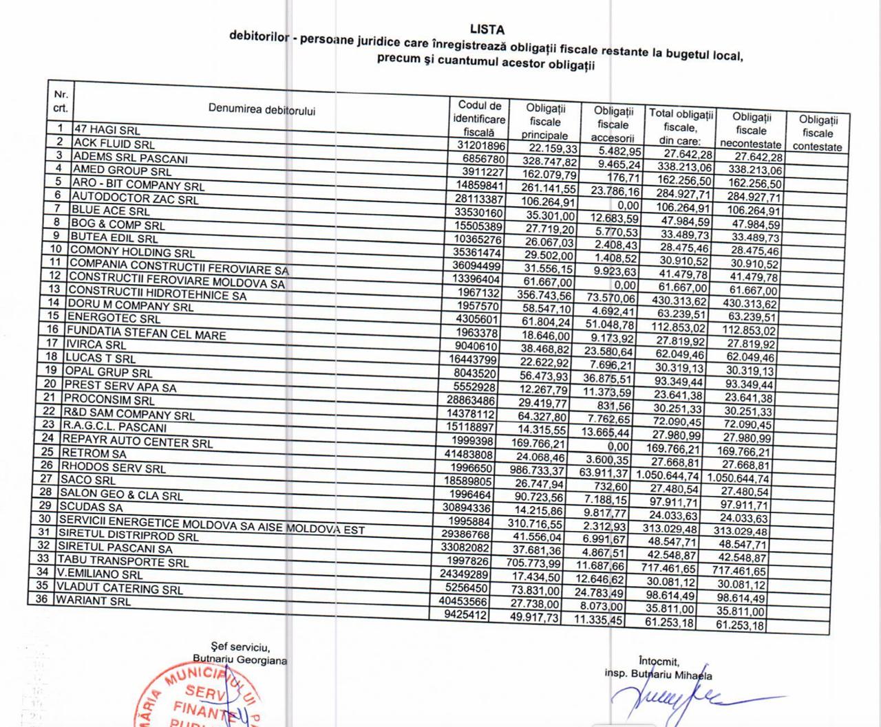 Administrația locală din Pașcani a publica încă o listă cu persoanele juridica care înregistrează restanțe la bugetul local. Documentul este disponibil pe site-ul Primăriei și cuprinde 36 de societăți.