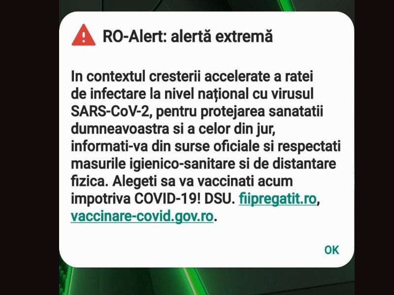 Un mesaj RO ALERT a facut toate telefoanele sa sune in Pascani, Targu Frumos, Harlau, precum si in toata tara. Autoritatile nationale au decis sa transmita saptamanal un mesaj prin care este precizata importanța respectării măsurilor de prevenire a răspândirii infecției cu SARS CoV-2 și de informare din surse oficiale, precum și recomandarea foarte fermă de vaccinare.
