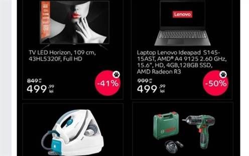 Astfel, in superoferta eMag de Black Friday vor fi: televizor LED Horizon cu diagonala de 109 cm la 499, 99 de lei, o stație de călcat Tefal Easy Pressing la 299, 99 de lei, scutece pampers Active Baby XXL BOX la 99,99 de lei, un laptop Lenovo Ideapad la 499, 99 de lei, o mașină de găurit și înșurubat la 199, 99 de lei și anvelopa de iarna Tigar la 99, 99 de lei.