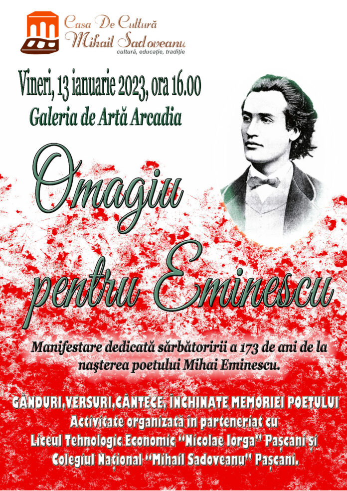 Ziua marelui scriitor național, Mihai Eminescu, va fi marcată în avans în municipiul Pașcani, la Casa de Cultură Mihail Sadoveanu. Vineri, 13 ianuarie, de la ora 16:00, în sala Arcadia a instituției de cultură membrii Trupei de Teatru Prometeu împreună cu elevi și profesori din două școli din oraș, Liceul Tehnologic Economic Nicolae Iorga și Colegiul Național Mihail Sadoveanu, vor aduce un omagiu scriitorului.