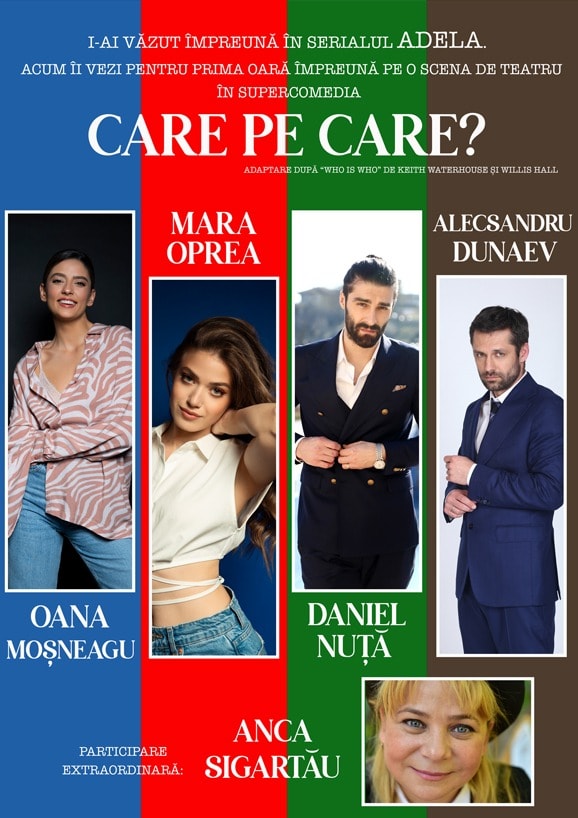 Luna octombrie incepe cu o super-comedie, la Casa de Cultura Mihail Sadoveanu din municipiul Pascani. Pascanenii sunt invitati la o portie sanatoasa de voie buna si umor urmarind piesa de teatru „Care pe care”, luni, 3 octombrie, de la ora 19:00. Vor urca pe scena institutiei actori de renume, precum Anca Sigartau, si alti colegi ai sai din filmul „Adela”, difuzat la Antena 1.