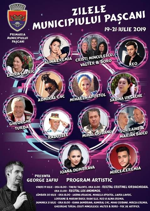 Deschiderea oficiala a zilelor municipiului va avea loc vineri, 19 iulie, in sala de festivitati a Primariei Pascani , de la ora 11:00 . Sunt programate mai multe activități printre care acordarea titlului de cetăţean de onoare a Municipiului Pașcani veteranilor de război, semnarea Acordului de înfrățire cu Comuna Pașcani, din Republica Moldova, premierea şefilor de promoţie și e elevilor care au obținut media 10 la Evaluarea Națională dar si un spectacol artistic susținut de Ansamblul de dansuri ”Rapsozii Siretului” Pașcani, Luiza Ștefania Muscalu si Duo Lyrics.