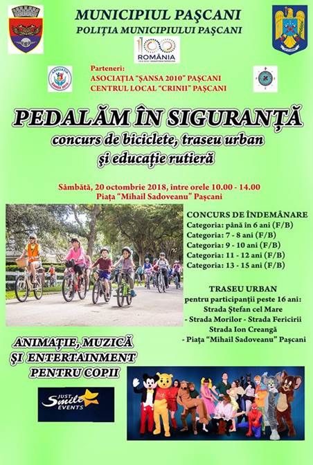 Primaria Municipiului Pascani organizeaza evenimente dupa evenimente pentru cetateni. Sambata, 20 octombrie, este randul prichindeilor si adolescentilor sa se bucure de un concurs organizat special pentru ei: unul de biciclete si educatie rutiera.