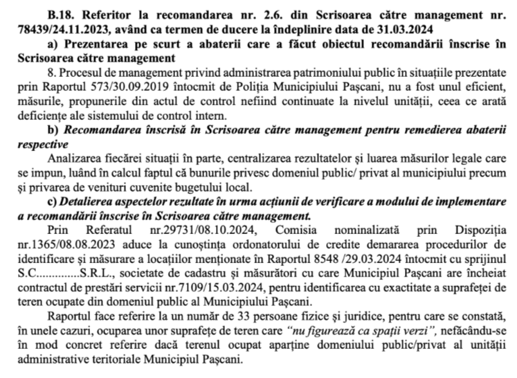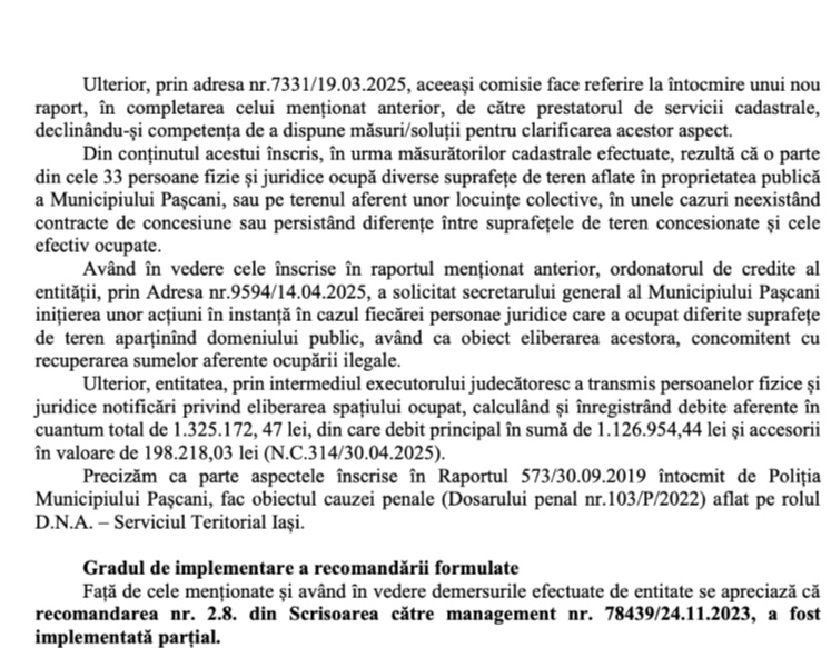 De asemenea, în raportul Curții de Conturi se arată că „Procesul de management privind administrarea patrimoniului public în situațiile prezentate prin Raportul 573/30.09.2019 întocmit de Poliția Municipiului Pașcani, nu a fost unul eficient, măsurile, propunerile din actul de control nefiind continuate la nivelul unității, ceea ce arată deficiențe ale sistemului de control intern.”