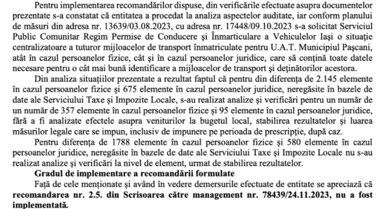 Menționăm că inspectorii Curții de Conturi au constatat și alte probleme grave în activitatea Primăriei Pașcani. De exemplu, 2.145 de mașini deținute de persoanele fizice și 675 de mașini deținute de persoanele juridice din Pașcani nu se regăsesc în bazele de date ale Serviciului Taxe și Impozite Locale din Pașcani, deși sunt înmatriculate. Asta înseamnă că mașinile respective nu sunt impozitate. Neregulile au fost descoperite la un control din anul 2023 privind activitatea din anul 2022, după verificarea bazelor de date de la Serviciul Public Comunitar Regim Permise de Conducere și Înmatriculare a Vehiculelor Iași. De atunci și până acum „s-au realizat analize și verificări pentru un număr de 357 elemente în cazul persoanelor fizice și 95 elemente în cazul persoanelor juridice, fără a fi analizate efectele asupra veniturilor la bugetul local, stabilirea rezultatelor și luarea măsurilor legale care se impun, inclusiv de impunere pe perioada de prescripție, după caz,” se arată în același raport.