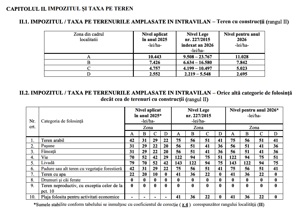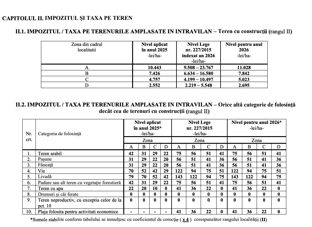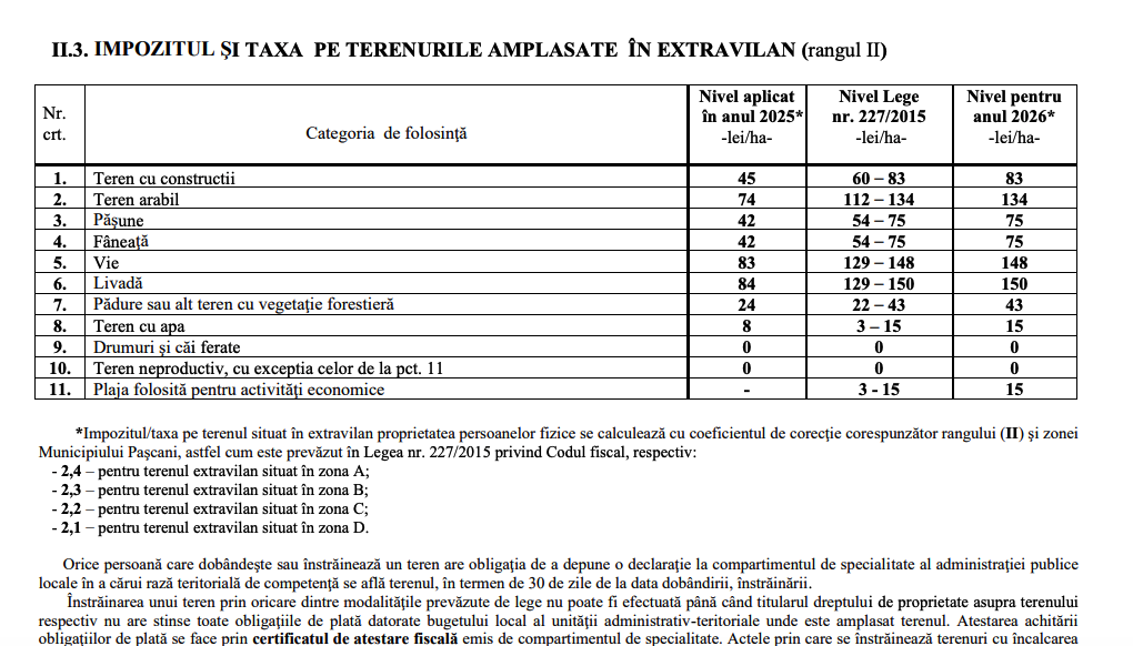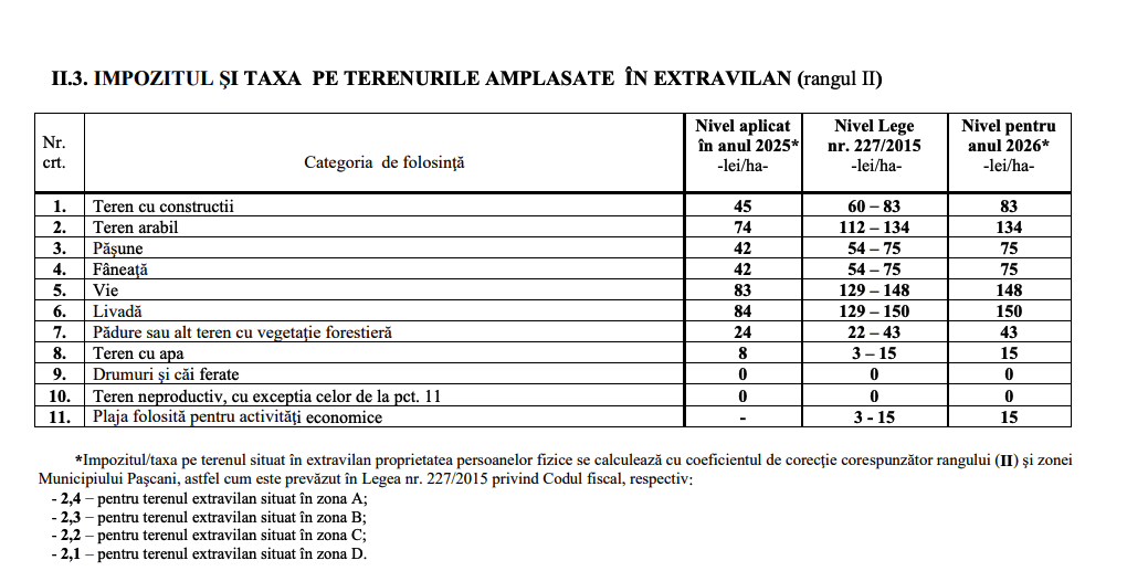Privitor la impozitul pe terenurile din intravilan, el poate fi între 9508 lei și 23.767 lei pe un hectar aflat în zona A a localității, dar la Pașcani pentru anul 2026 primarul a propus majorarea de la 10.443 de lei la 11.028 de lei. Și pentru terenurile amplasate în extravilan, persoanele fizice vor plăti în 2026 taxe mai mari. Statul prevede un impozit între 60 și 83 lei pe hectar pentru terenuri cu construcții, iar Primăria Pașcani a propus 83 de lei. Terenul arabil are o marjă de impozitare între 112 și 134 de lei/hectar, iar la Pașcani propunerea este de 134 lei.