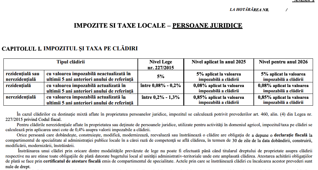 În ceea ce privește persoanele juridice pentru clădirile nerezidențiale, administrația locală propune un coeficient de 0.85%, în timp ce minimul prevăzut de lege este de 0,2%.