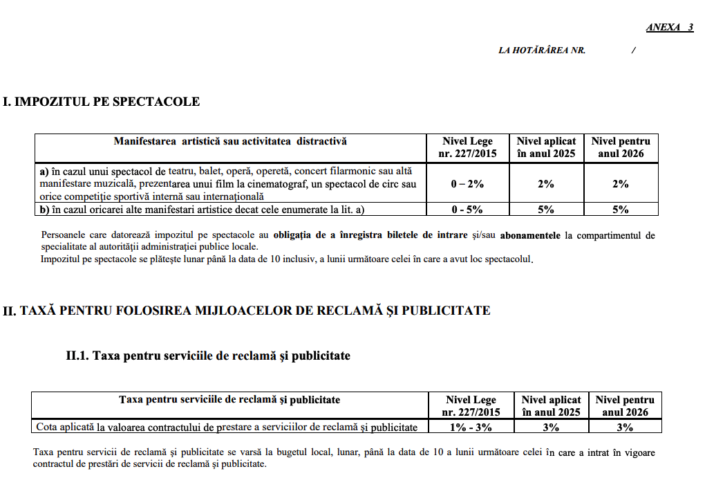 În maximum sunt și nivelurile de impozitare pentru spectacole, respectiv 2% și 5%, iar taxa de reclamă și publicitate este menținută la 3%, taxa minimă fiind 1%.