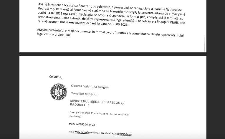 „Având în vedere necesitatea finalizării, cu celeritate, a procesului de renegociere a Planului Național de Redresare şi Rezilienţă al României, vă rugăm să ne transmiteţi cu reply la prezenta adresa de e-mail până astăzi 04.07.2025 ora 14:00, declaraţia pe propria răspundere, în format pdf., completată și semnată, cu semnătură electronică extinsă, de către reprezentantul legal al entității beneficiare a finanţării PNRR, prin care vă asumați finalizarea investiției până la data de 30.06.2026.”