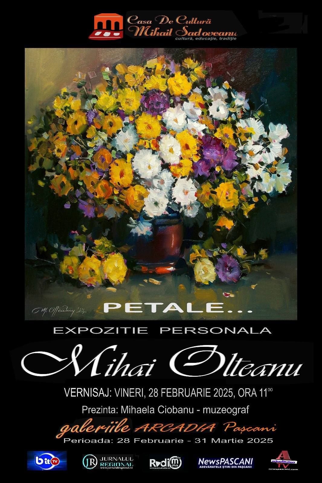 Primăvara începe cu artă, la Casa de Cultură Mihail Sadoveanu din municipiul Pașcani. Vineri, 28 februarie, de la ora 11:00, va avea loc vernisajul expoziției de pictură, semnată de Mihai Olteanu, cu titlul „Petale…”.