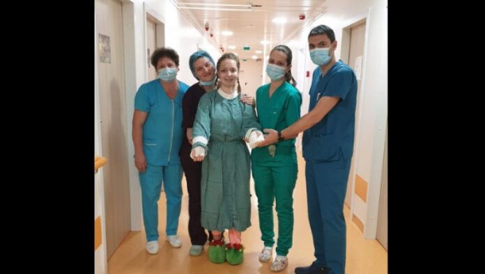 Alexia, adolescenta de 15 ani, operată cu succes la Iași, după ce brațele i-au fost amputate într-un grav accident rutier la Pașcani, se simte bine și a început să se plimbe pe holurile spitalului unde este internată.