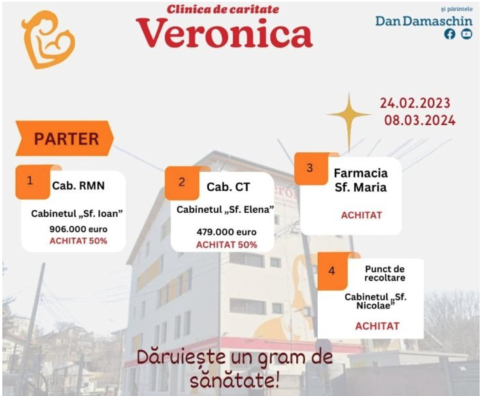 „Ştiţi cu toţii că odată cu deschiderea Clinicii Veronica ne propunem să salvăm vieţi şi să redăm speranţa la viaţă mamelor, copiilor nevoiaşi, familiilor cu mulţi copii care duc grija zilei de mâine, oamenilor sărmani, care nu-şi permit să se trateze în timp util, dar şi tuturor persoanelor asigurate sau neasigurate, care doresc să aibă acces la servicii de specialitate şi aparatură performantă, însă nu putem reuşi fără ajutorul vostru. În această lună dedicată femeii şi mai ales mamei care dă naştere pruncilor în dureri doar de ea ştiute, ne dorim să cinstim mamele de pretutindeni şi să le fim aproape în momentele de grea încercare”, a spus pr. Dan Damaschin, într-o postare pe pagina sa de Facebook.