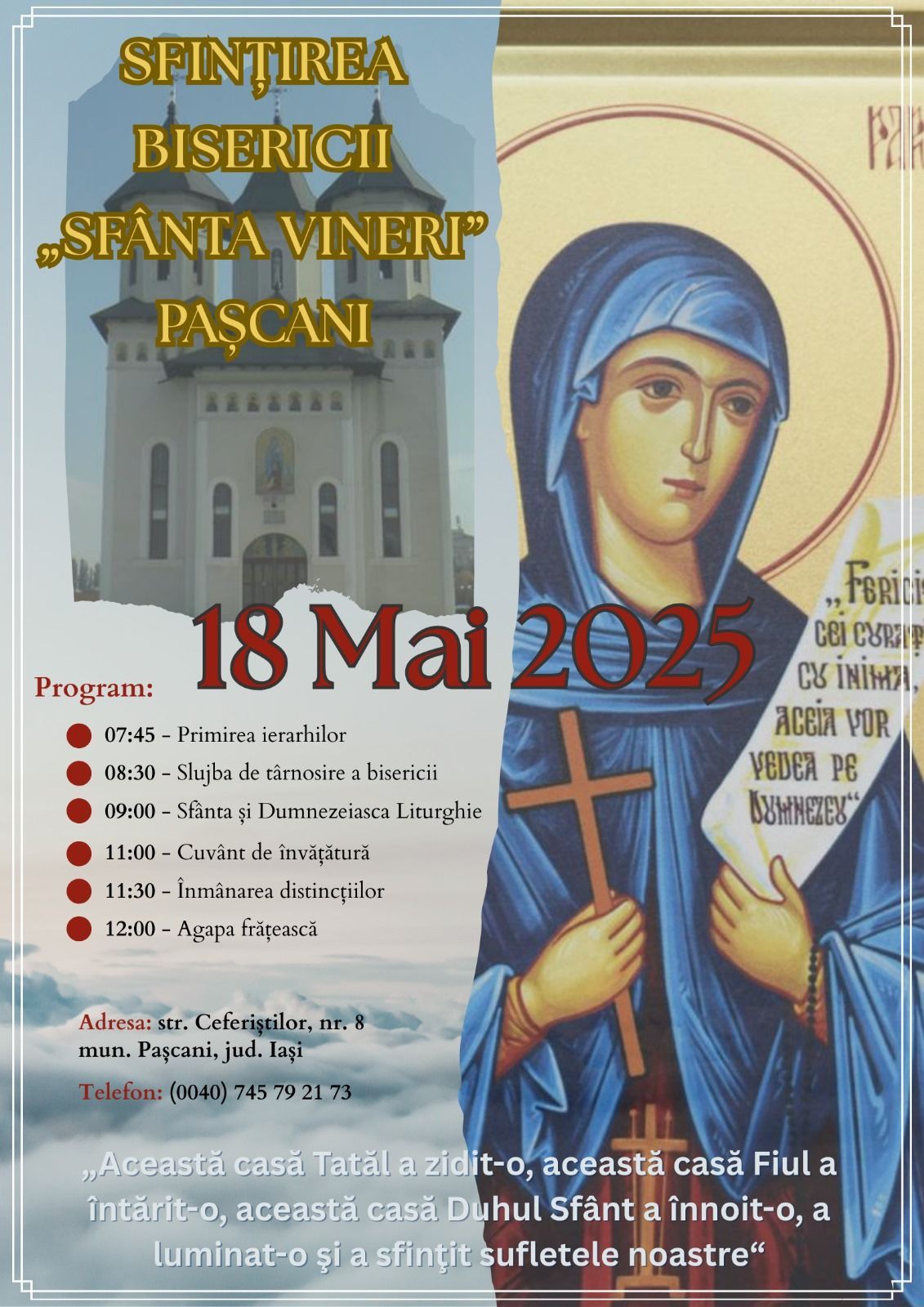 Pașcănenii și nu numai sunt așteptați duminică, 18 mai 2025, la un moment deosebit în viața comunității: sfințirea Bisericii „Sfânta Vineri” din municipiu. Evenimentul religios se va desfășura începând cu ora 07:45, la lăcașul de cult situat pe strada Ceferiștilor nr. 8, și va include mai multe momente importante, potrivit programului anunțat de organizatori.