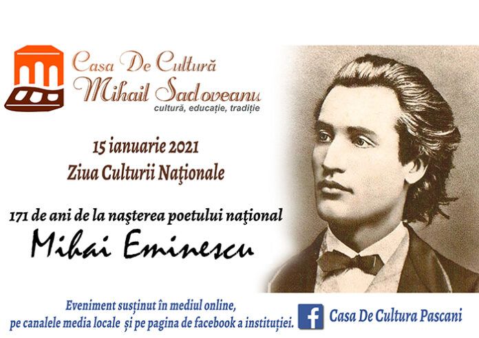 Vineri, 15 ianuarie, de Ziua Culturii Nationale, respectiv implinirea a 171 de ani de la nasterea poetului, Mihai Eminescu, la Pascani are loc o manifestare culturala dedicata marelui artist. Casa Municipala de Cultura “Mihail Sadoveanu” organizeaza online, de aceasta data, un recital de poezie din lirica eminesciană realizat de membrii trupei de teatru „Prometeu” a institutiei publice.