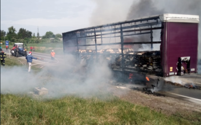 Incendiul ar fi pornit de la o scanteia produsa in timp ce camionul circula pe drum, iar marfa a fost distrusa in proportie de 80%.