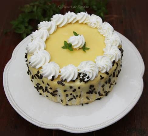 Decor – 1/4 portie lemon curd , 50 ml apa, 5 gr gelatina , 100 gr frisca batuta, decor de ciocolata.