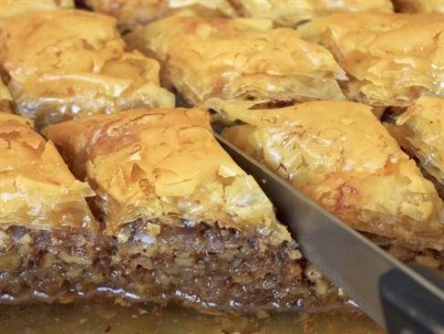 3. Intre timp ai topit margarina, cu care acum ungi tava de baclava. In tava incepi sa asezi foile de placinta, una cate una, unse intre ele, vreo 5-6. Pe ultima foaie, neunsa, asezi o jumatate din bogatia de nuca. Apoi din nou, foaie de foaie, unse intre ele, vreo 3-4, de data asta. Din nou, pe ultima foaie neunsa asezi restul de nuca. Dupa care pui capac restul foilor, iarasi unse intre ele cu margarina cea topita.