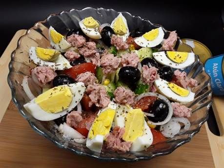 Punem apoi maslinele, ouale fierte curatate de coaja si taiate in 4 sau in 6. La final adaugam si tonul.