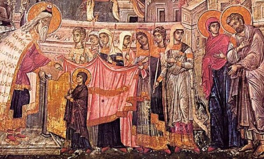 Potrivit tradiției bisericești, Fecioara Maria a fost dusă la Templul din Ierusalim când avea doar trei ani, fiind închinată lui Dumnezeu de părinții ei, Ioachim și Ana. A rămas acolo până în adolescență, într-un spațiu rezervat celor mai curate și mai sfinte, pregătindu-se pentru misiunea de a deveni Maica Mântuitorului.