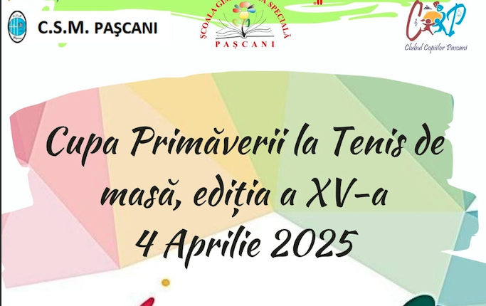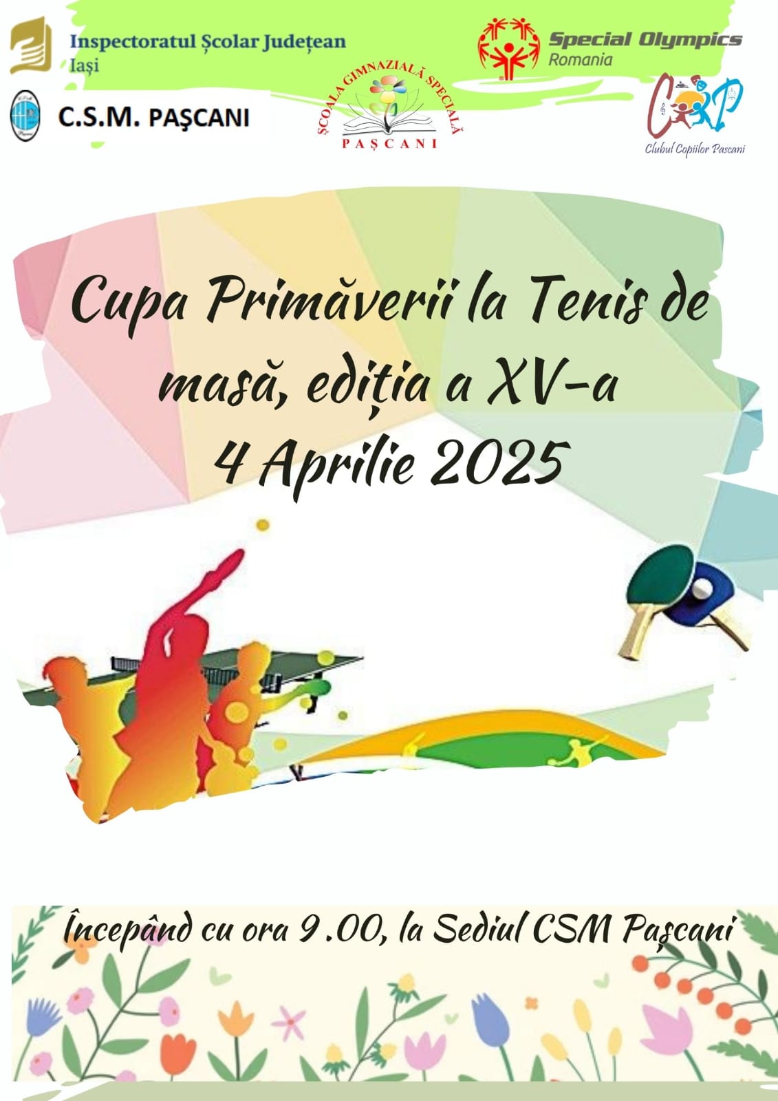„Școala Gimnazială Specială Pașcani, în parteneriat cu ISJ Iași, Clubul Sportiv Municipal Pașcani, Clubul Copiilor Pașcani și organizația Special Olympics Romania, va organiza cea de-a XV-a ediție a competiției„ Cupa Primăverii” la tenis de masă, în data de 4 Aprilie 2025, în săptămâna „Școala altfel”.