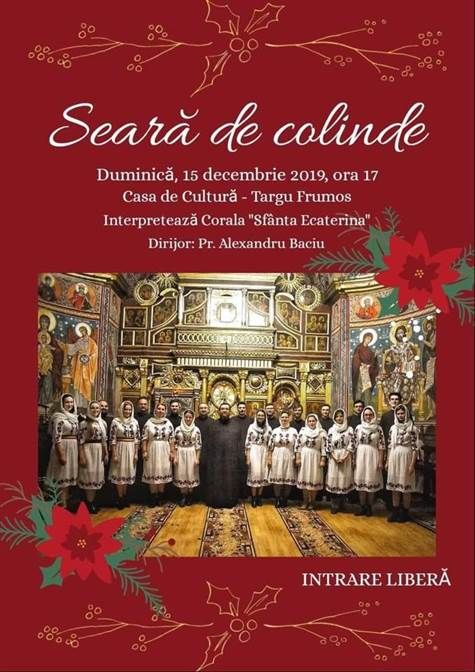 „Duminică, 15 Decembrie 2019, începând cu orele 17:00, preoții din Protopopiatul Pașcani împreuna cu Primăria Orașului Târgu Frumos vă invită la o seară magică in preajma sărbătorilor de Crăciun, in sala mare a Casei de Cultura. Corala „SF. Ecaterina”, va susține un concert extraordinar de colinde traditionale. Evenimentul va dura timp de mai multe ore, iar intrarea va fi gratuită. Vă așteptam cu drag!” a precizat primarul orasului, Ionel Vatamanu, intr-o postare pe Facebook.