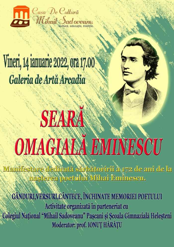 “Vineri, 14 ianuarie 2022 vom marca 172 de ani de la nașterea poetului Mihai Eminescu. Sub titlul Seară omagială Eminescu începând cu ora 17.00 , în sala Arcadia vom marca Ziua Națională a Culturii prin versuri, gânduri și cântece închinate marelui poet. Manifestarea este organizată de Casa Municipală de Cultură ,,Mihail Sadoveanu ” din Pașcani în parteneriat cu Colegiul Național ,,Mihail Sadoveanu” din Pașcani , Școala Gimnazială Heleșteni. Își dau concursul membrii trupei de teatru Prometeu al Casei de Cultură, elevi de la instituțiile de învățământ enumerate împreună cu profesorii coordonatori. Manifestarea va fi moderată de prof. Ionuț Hărățu de la Liceul Teoretic Miron Costin din Pașcani.